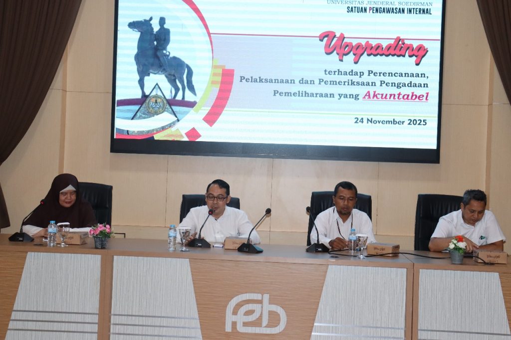 Bertempat di Ruang Rapat Lt. 6 Laboratorium Terpadu Fakultas Ekonomi dan Bisnis (FEB) Universitas Jenderal Soedirman (Unsoed), Senin (24/11) Satuan Pengawasan Internal gelar Upgrading Kemampuan Perencanaan, Pelaksanaan dan Pemeriksaan Pengadaan Pemeliharaan. Kegiatan yang dibuka oleh Wakil Rektor Bidang Perencanaan, Kerjasama dan Humas ini diikuti PPK, staf PPK, staf perencana, dan PTK di lingkungan Unsoed. Dalam laporannya Ketua Panitia Dr. Abdullah Nur Aziz, S.Si., M.Si., menyampaikan tujuan dilaksanakan upgrading ini, untuk meningkatkan kualitas perencanaan dan pelaksanaan pemeliharaan bangunan gedung perkantoran maupun mesin peralatan, agar tercapai prinsip ekonomis, efisien dan efektif. Acara yang dimoderatori oleh Dr. Laeli Budiarti, S.E., M.Si., Ak., menghadirkan narasumber Dr. Ir. Gandjar Pamudji, S.T., M.T., IPU., CPIA., dan Latief Nur Muhammad, S.T.