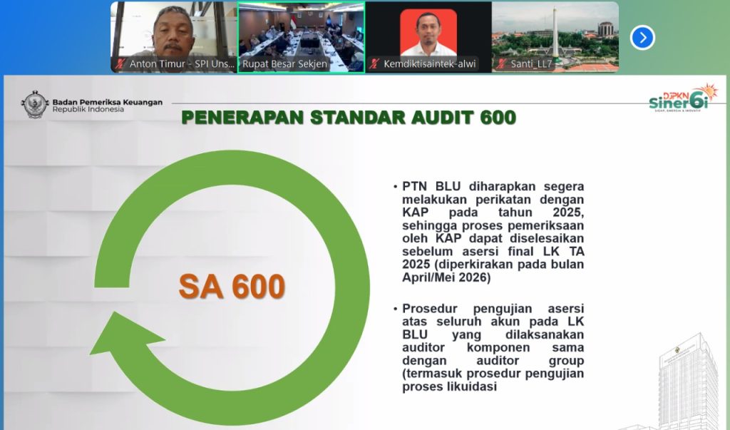 Di Akhir tahun 2025, Badan Pemeriksa Keuangan (BPK) Republik Indonesia, akan melaksanakan audit interim atas Laporan Keuangan Tahun 2025, mulai tanggal 10 November hingga 31 Desember 2025 di lingkungan Kemendiktisaintek. Terkait dengan hal tersebut maka BPK melaksanakan entry meeting. Acara yang dilaksanakan secara daring ini dihadiri oleh Sekretaris Jenderal, Inspektur Jenderal Kemendiktisaintek Direktur Pemeriksaan 6 BPK serta diikuti pimpinan unit dan SPI di lingkungan Kemendiktisaintek.